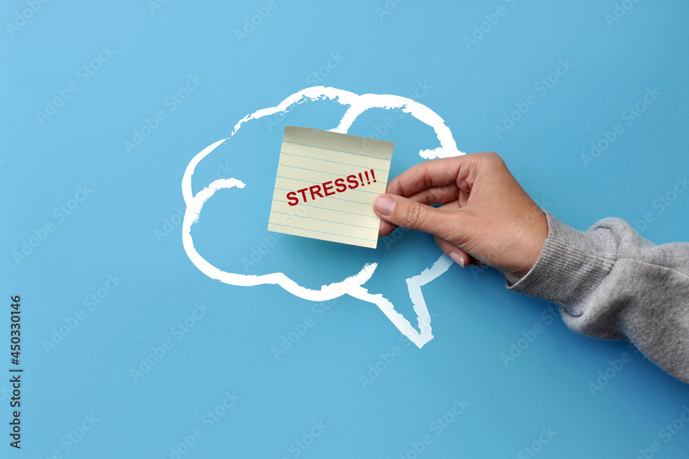 The silhouette of the brain and a sticker with the word "stress" on it. A symbol of stress in a person's life