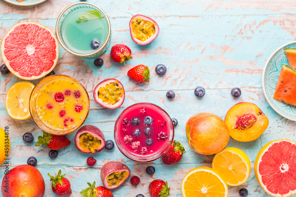 Variation of smoothies and refreshing drinks with fresh fruits for hot summer