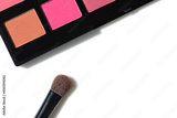 Professional colorful eyeshadow palette with make up brush on the white background. Copy space