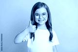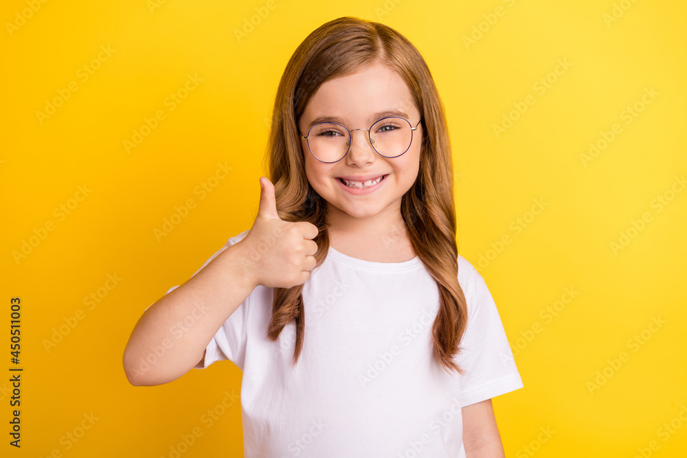 Photo of young little girl happy positive smile show thumb-up like fine recommend ad isolated over yellow color background