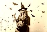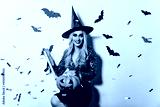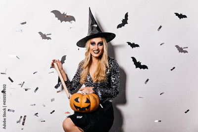 Magnificent girl in sparkle blouse holding halloween pumpkin. Indoor photo of smiling pleased witch in black hat.
