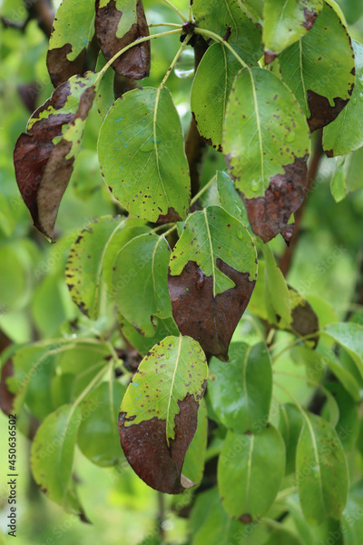 Brown spots on Pear tree green leaves on branches. Pyrus tree with disease in the orchard