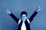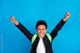 Photo of cheerful young happy positive boy raise fists winner good mood school isolated on blue color background