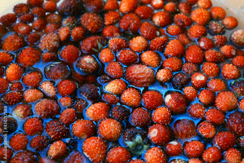 Forest strawberries, wild strawberries. Ripe berry, background.
