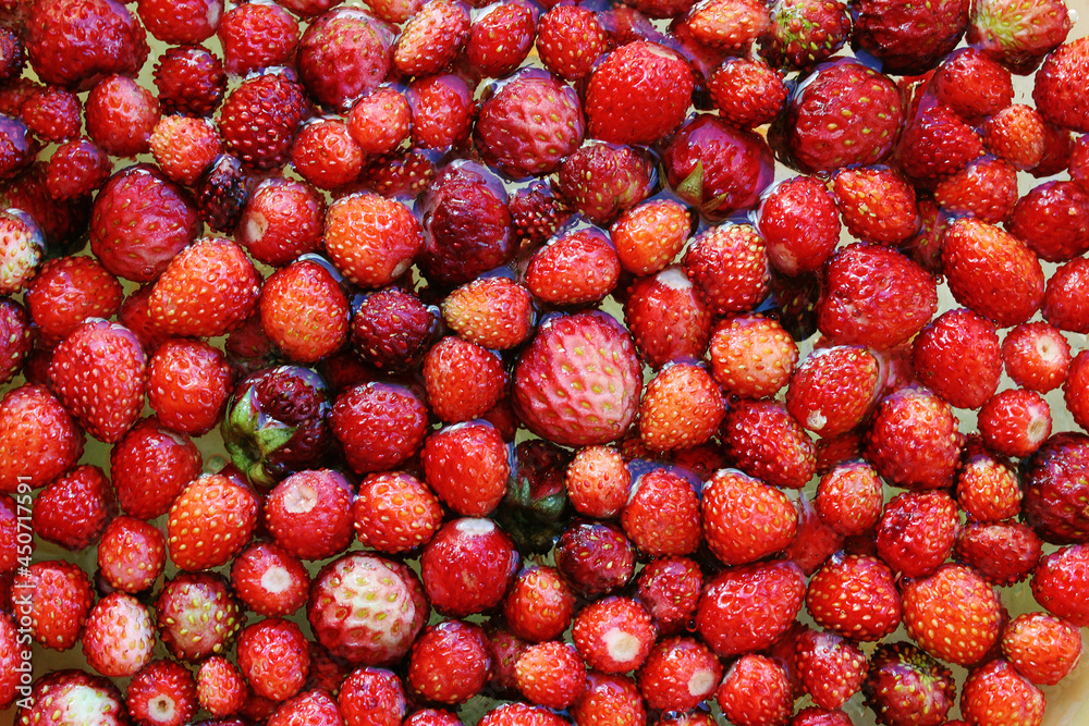 Forest strawberries, wild strawberries. Ripe berry, background.