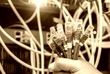 Close-up hand choose many RJ45 head of UTP LAN network cable and Lots of Ethernet cables background for connect computer and network devices to switch or hub modem router in cabinet.