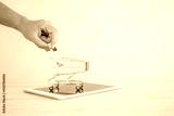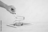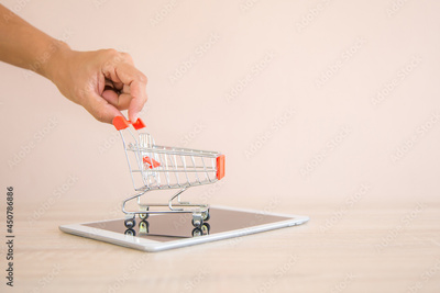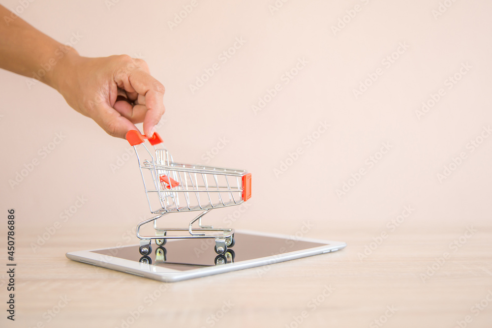 Close up the mini shopping cart and notepad at desk concept using the internet application for online shopping buying and spending on computer technology.