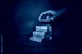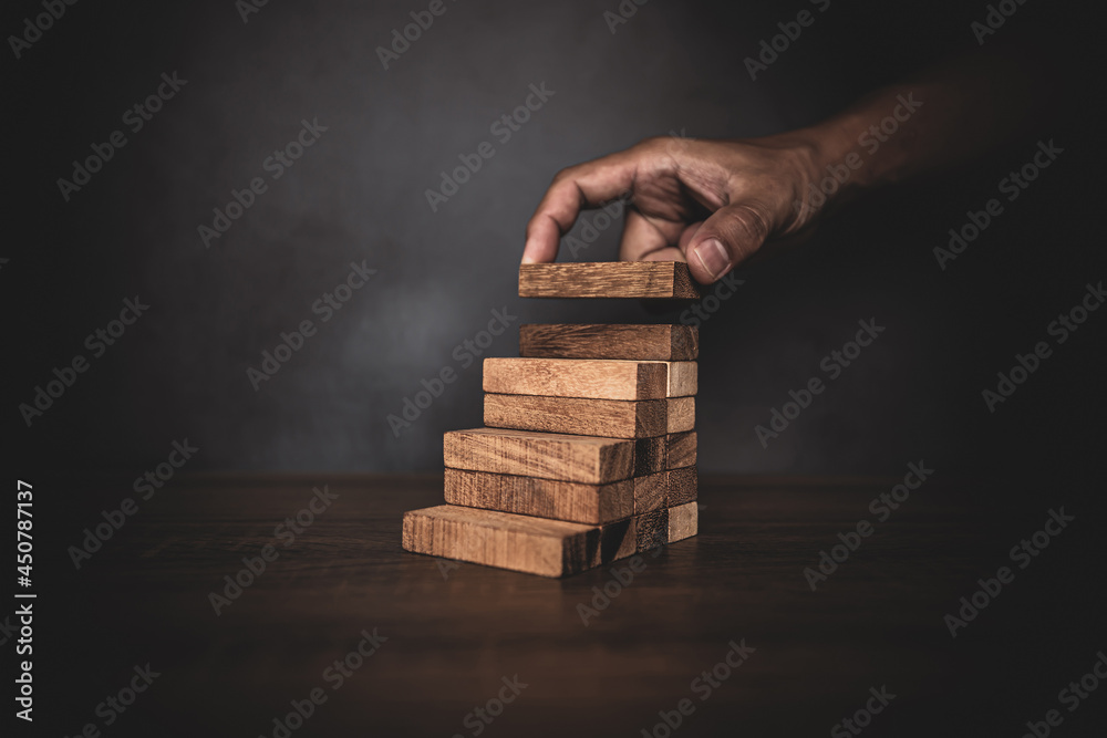 Close-up hand is placing wood block tower stacked in stair step with caution to prevent collapse or crash concepts of financial risk management and strategic planning.