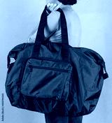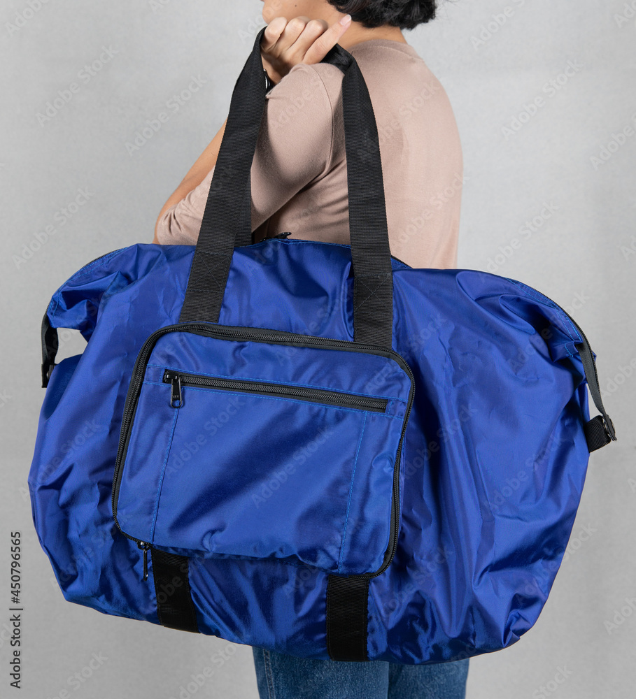 Closeup studio shot of female model in brown long sleeve shirt and jeans stand holding handle of fashionable trendy urban big gray unisex handbag with long shoulder strap in front of grey background