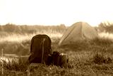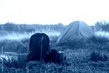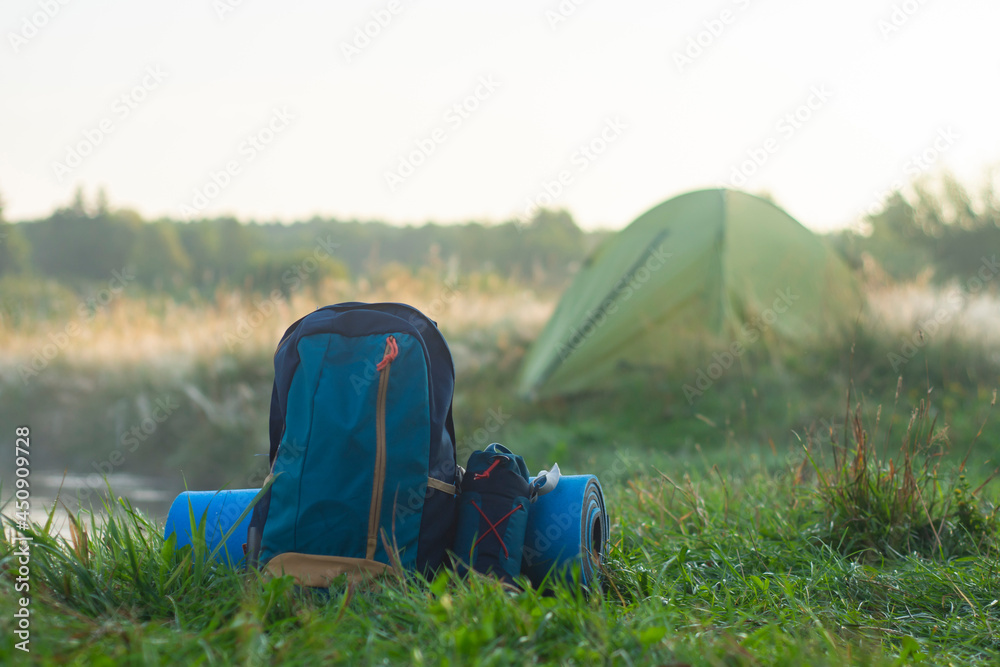 Sports backpack with a rug near a tourist tent on the background of nature and forest.