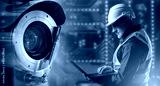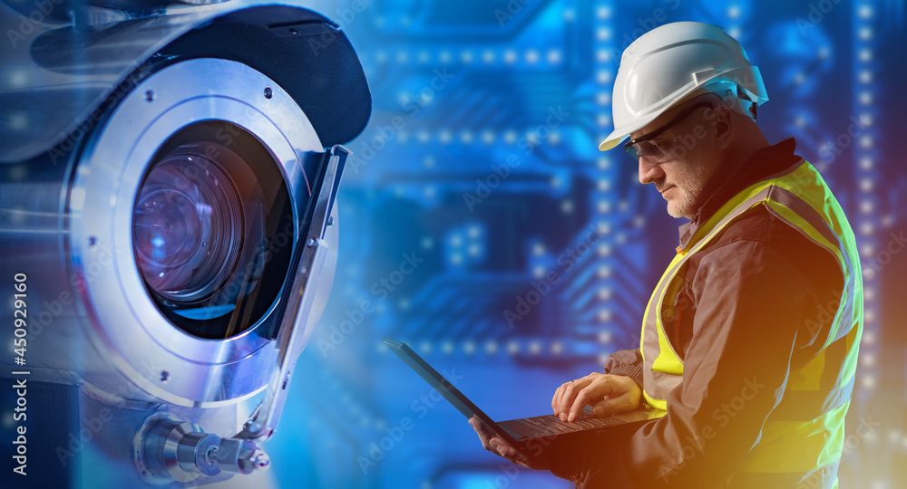 Setting up a video surveillance system. Security engineer configures cameras. Surveillance camera next to engineer. Video security systems setup concept. Video security system installation.