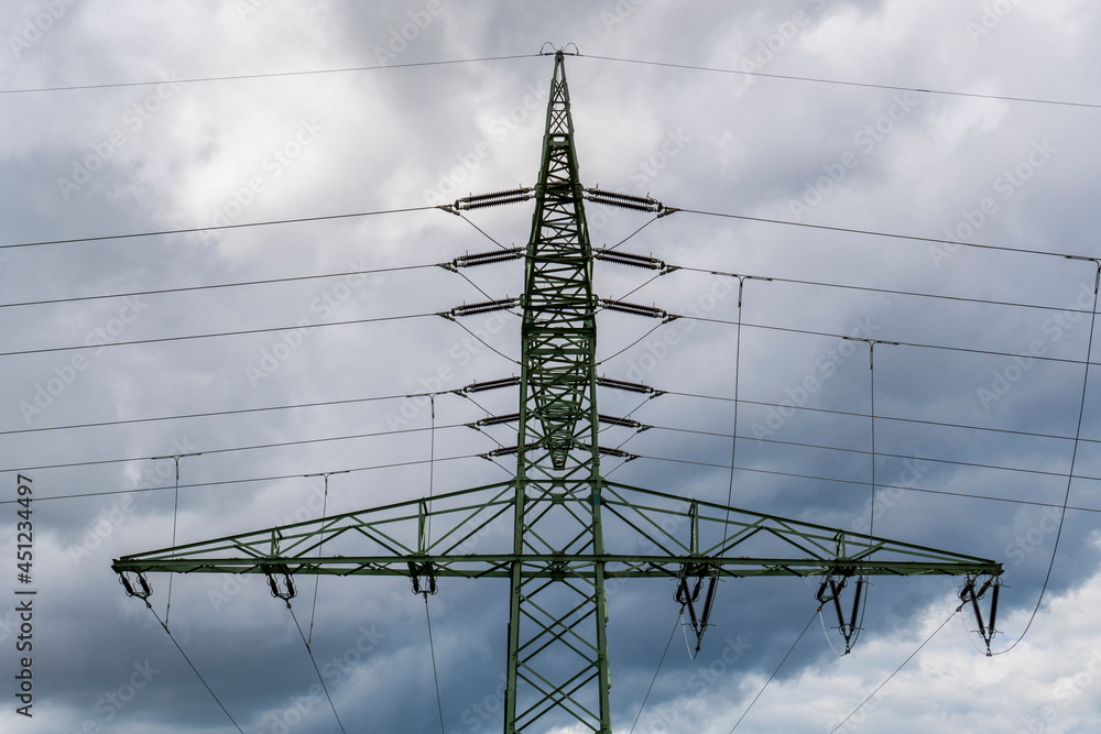 Strommast mit Kreuzung von Stromleitungen