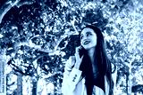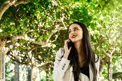Caucasian young businesswoman calling a friend with her phone in the park. She is happy and smiling