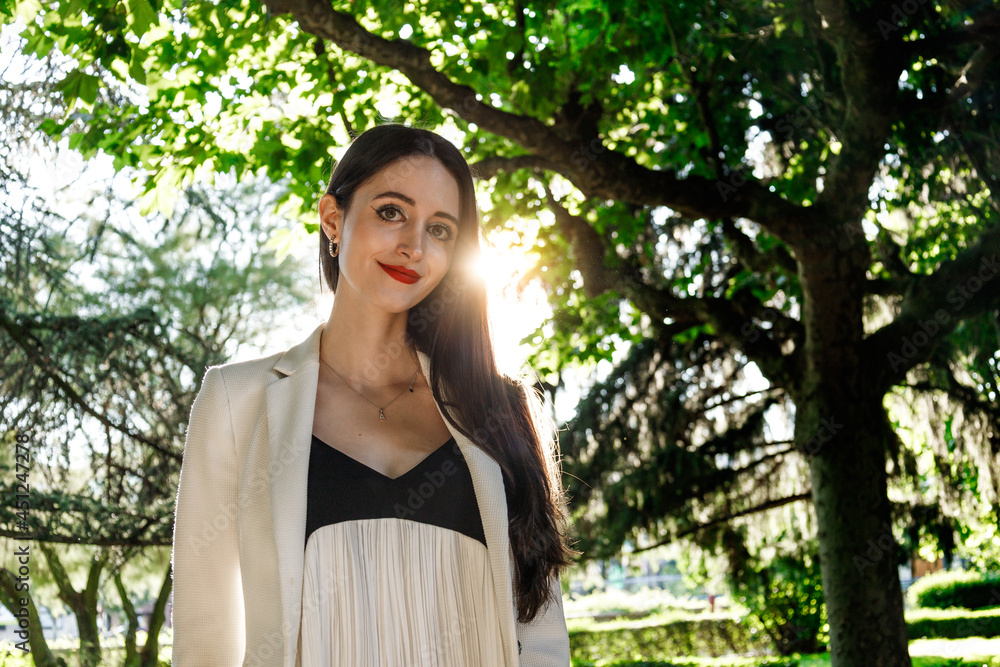Portrait of caucasian ethnicity young woman with formalwear in park. A sunbeam is entering in scene through her hair