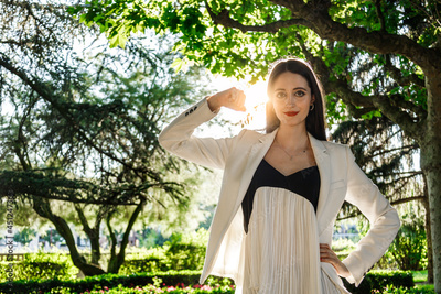 Caucasian white woman with formal wears showing biceps with a smile at park. Girl power concept