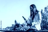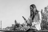 Caucasian young woman in formalwear using smartphone outdoors and laughing cause of a meme