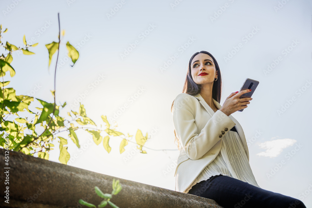 White young woman in formalwear using smartphone. Sunbeam of the sunset. Technology concept
