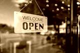 Open cafe or restaurant. Open sign board on glass door in modern cafe coffee shop