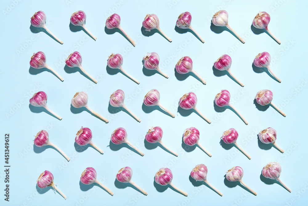 Bulbs of garlic on a colored background, colorful garlic pattern. Garlic pattern on cyan mint blue background