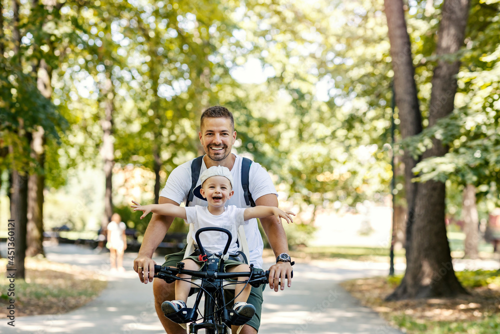 Father and son ride bicycles. Toddlers sit in a basket of bikes and wander around. Summer sunny family day, family bonding time. Active family weekend, vacation in the park with the family