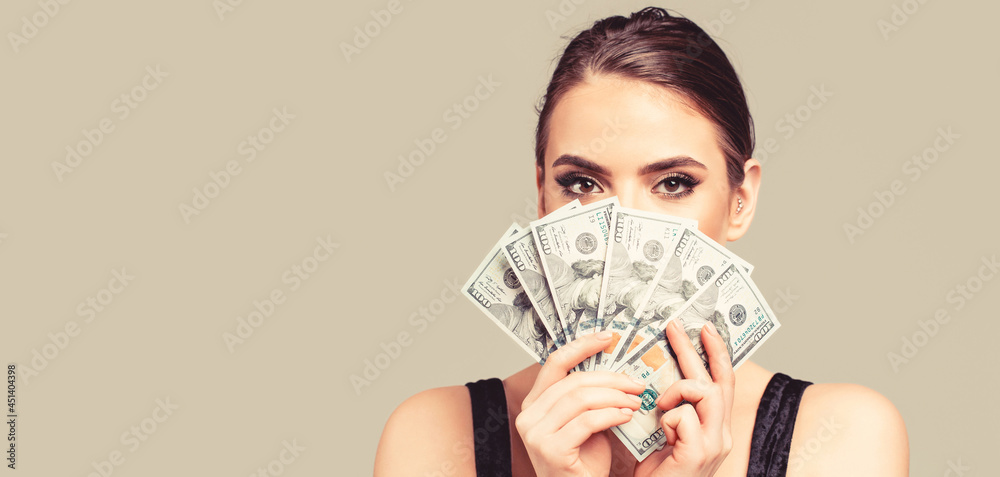 Girl holding cash money in dollar banknotes. Woman holding lots of money in dollar currency. Luxury, beauty and money concept