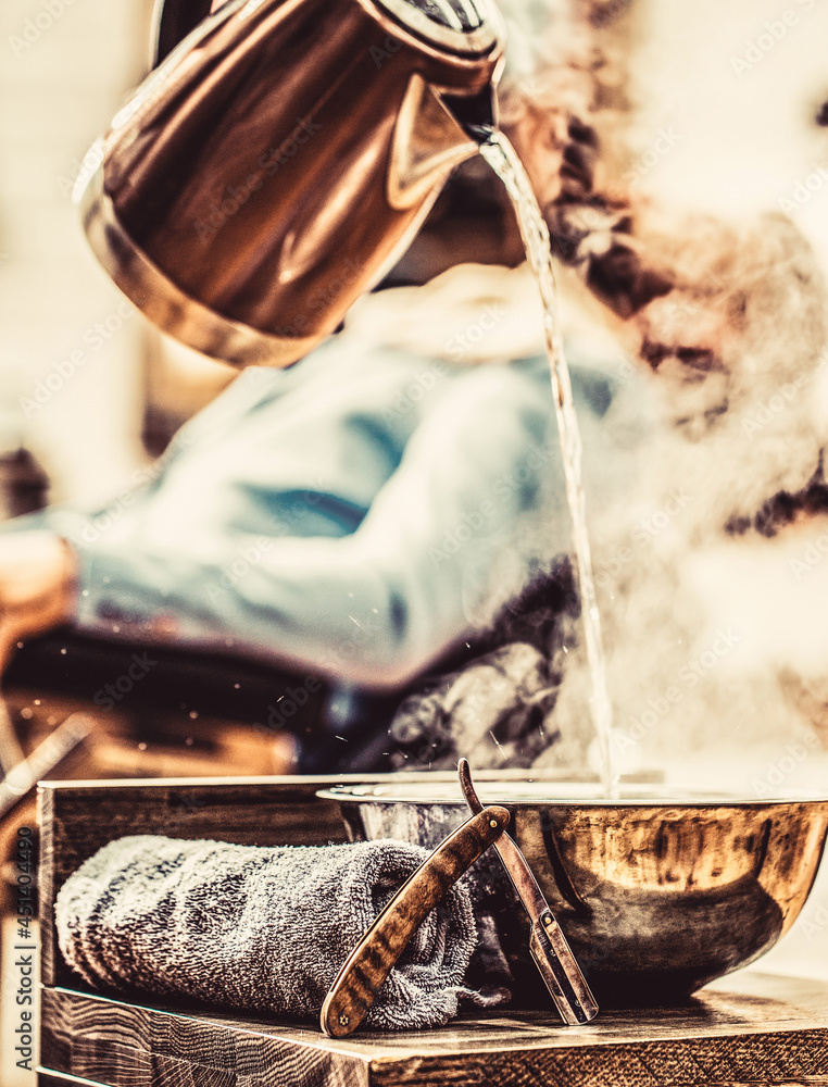 Straight razor, barbershop, towel. Barber shop salon. Men haircut. Man in barbershop salon Bearded man bear
