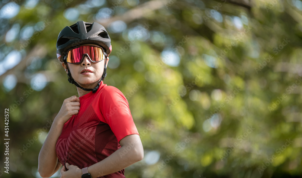 Portrait sport woman wearing sport suite helmet,glove and glasses,she competition on bicycle bike is adventure and extream game concept.