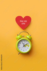 A green alarm clock and the inscription: "time to love" above it. Time for love