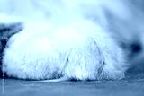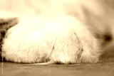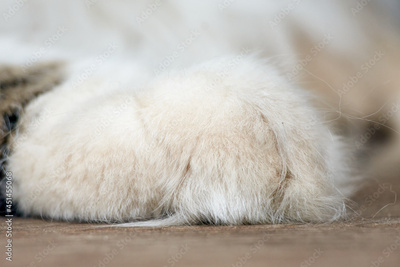 A closeup shot of a white furry cat paw