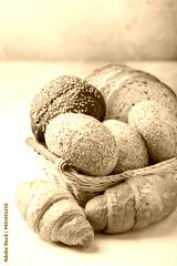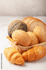 Assortment of freshly baked breads. Buns and croissants. Vertical format