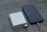 Power Bank charges a smartphone on a wooden bench in the park.