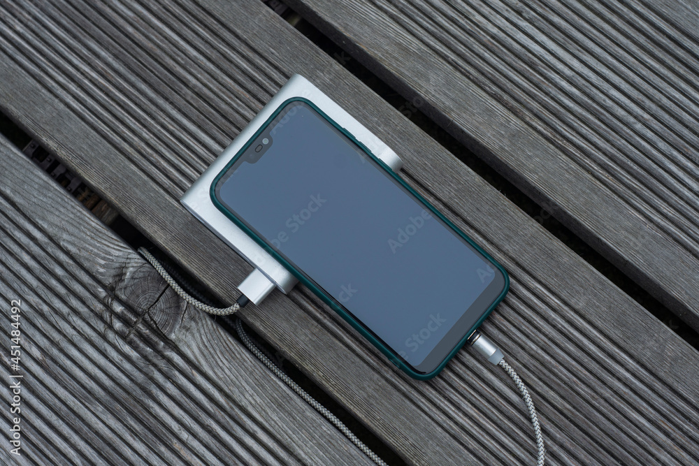 Power Bank charges a smartphone on a wooden bench in the park.