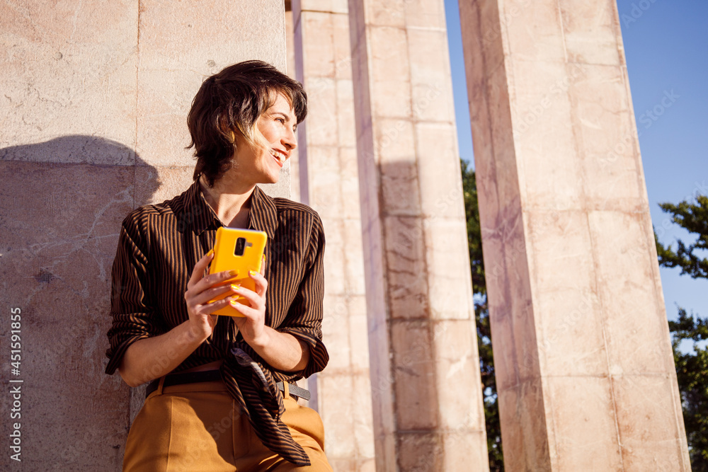 Frontal view of young caucasian woman with short hair laughing while using smartphone