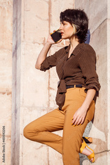 Fashionable young woman talking by phone leaning against the wall. Autumn clothing
