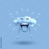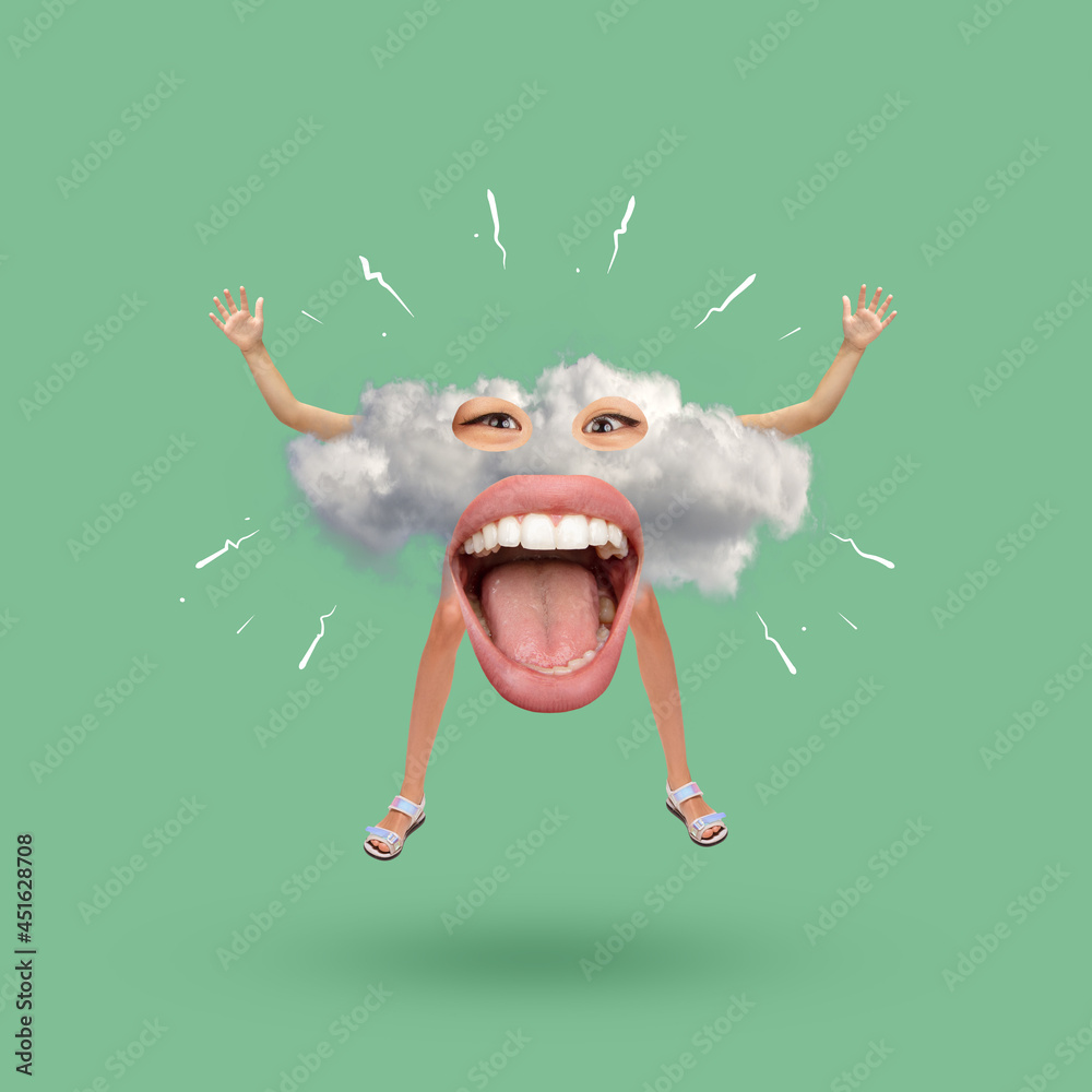 Modern design, contemporary art collage. Inspiration, idea, trendy urban magazine style. Big cloud with mouth, eyes and hands and legs on colored background