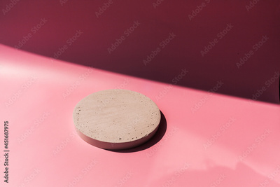 Concrete round podium in sun light with shadow on pink background. A scene with cement display show case for cosmetic beauty brands products mock up. Minimalistic abstract shopping sales concept