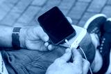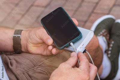 Man charges a smartphone with a power bank in hand. Portable charger for charging gadgets.