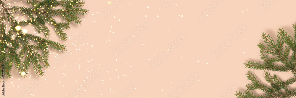 Banner with fir branches and glowing bokeh on a beige background. Christmas concept.