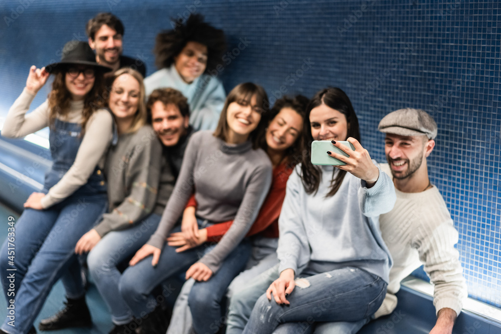 Happy young friends having fun doing selfie in metro subway station - Focus on hand holding mobile phone