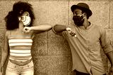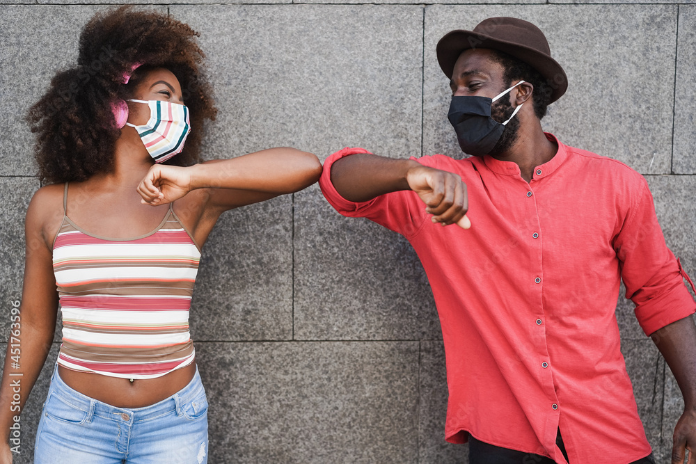 African people wearing face masks while bumping their elbows instead of greetings with hugs - Focus on faces