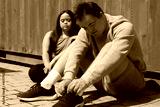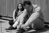 Young biracial couple with Down Syndrome in active wear sitting next to each other and tying shoes