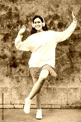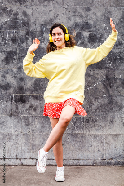 Young brunette woman dancing with a limp. Autumn outfit and headphones