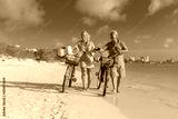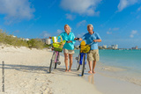 Happy senior couple exercising with bicycles on the beach on a sunny day