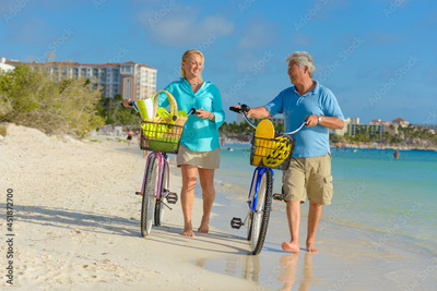 Happy senior couple exercising with bicycles on the beach on a sunny day