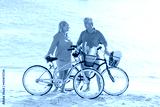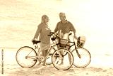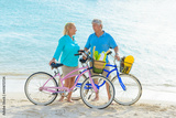 Happy senior couple exercising with bicycles on the beach on a sunny day