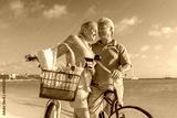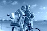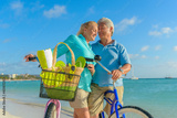 Happy senior couple exercising with bicycles on the beach on a sunny day