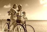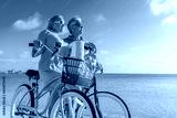 Happy senior couple exercising with bicycles on the beach on a sunny day