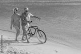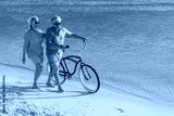 Happy senior couple exercising with bicycles on the beach on a sunny day