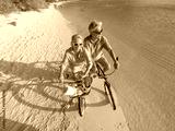 Happy senior couple exercising with bicycles on the beach on a sunny day
