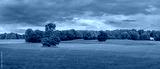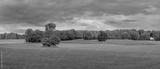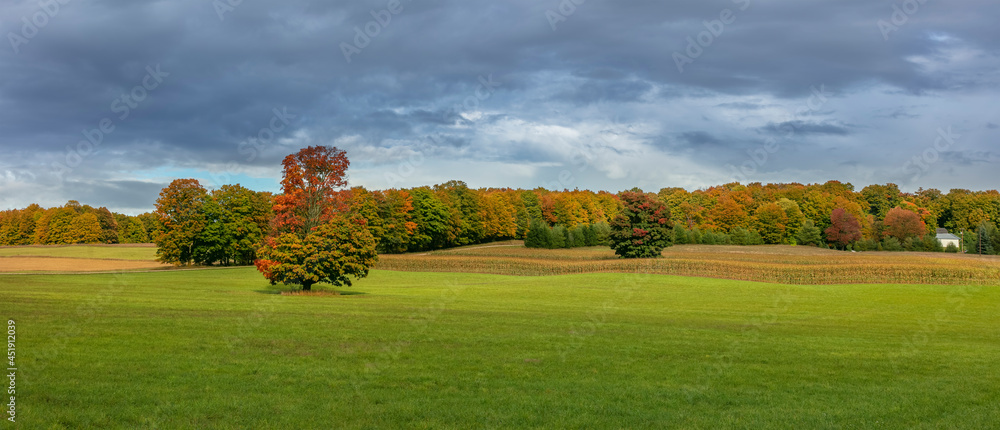Panoramic view of autumn trees in the meadow in Michigan countryside with dark cloudy sky